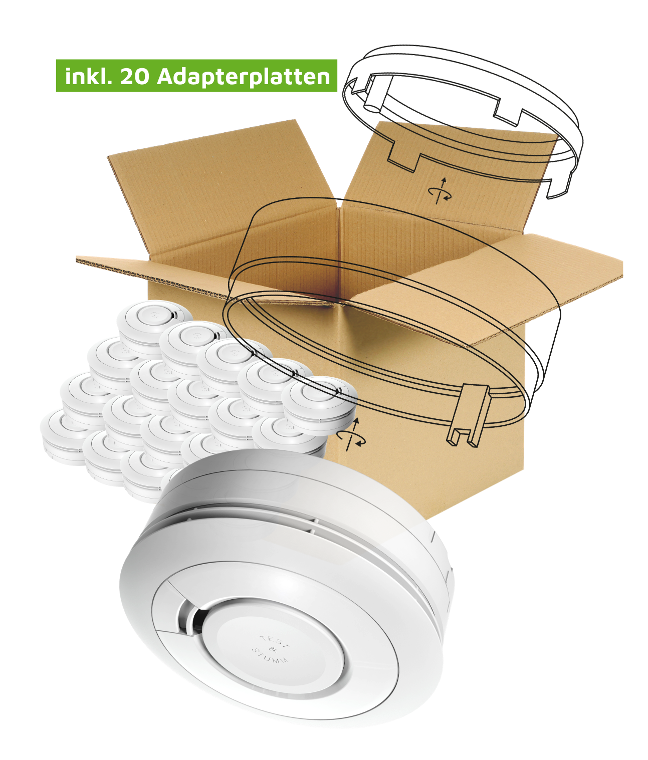 20er Sammelverpackung Ei650ikb inkl. 20 Wechseladapter für die Montageplatten sämtlicher Hekatron Genius- und Kidde-Rauchwarnmelder.